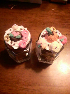 紙粘土に色を混ぜ、アイスっぽいものとリボンっぽいものとなんちゃってクッキーを作りました。ドーナツも乗ってます。